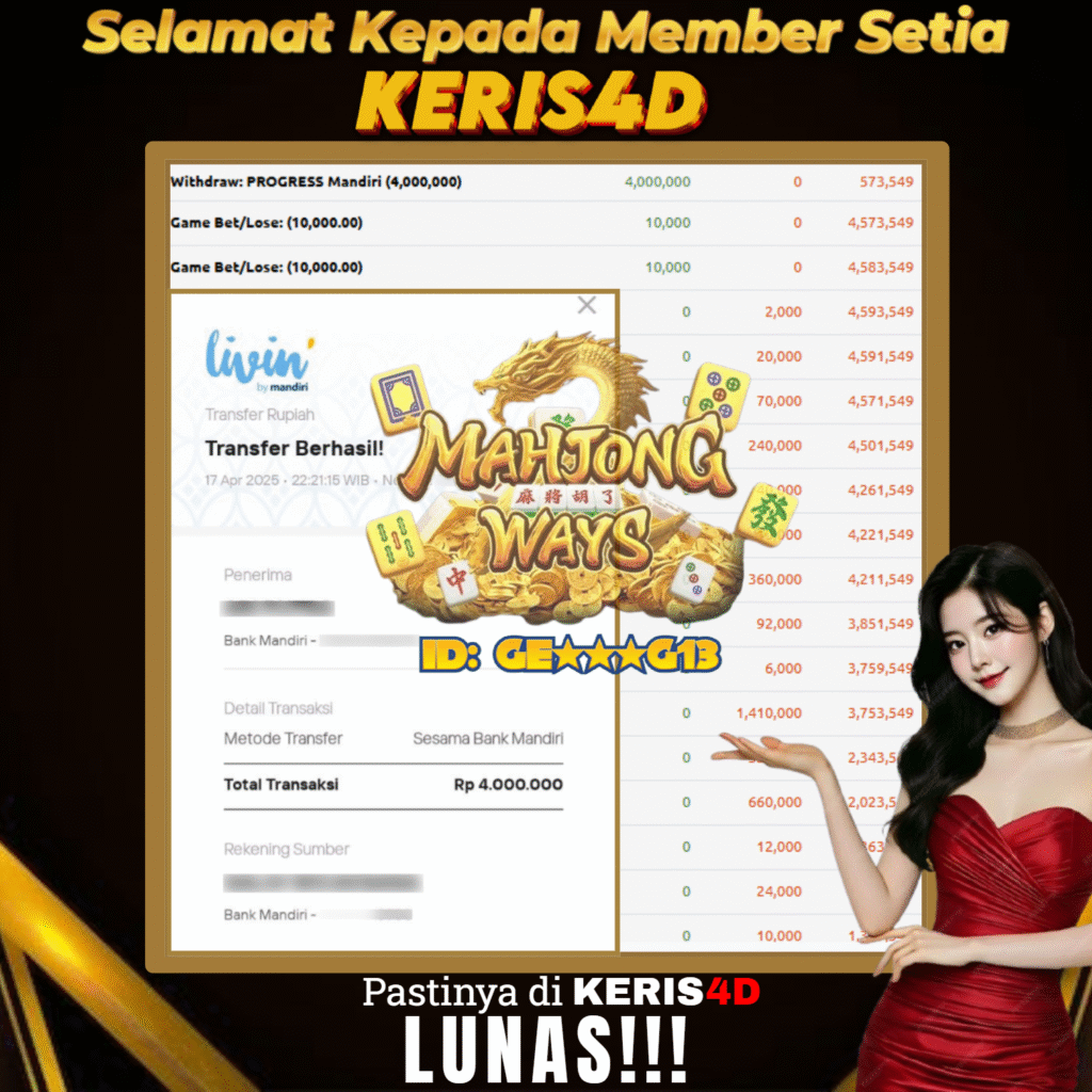 KERIS4D dikenal sebagai situs terpercaya yang selalu menghadirkan pengalaman bermain slot online yang aman, fair, dan berlisensi resmi. Di sini, kami tidak hanya sekadar memberikan janji, tapi bukti nyata berupa slip kemenangan yang dapat Anda lihat secara langsung.