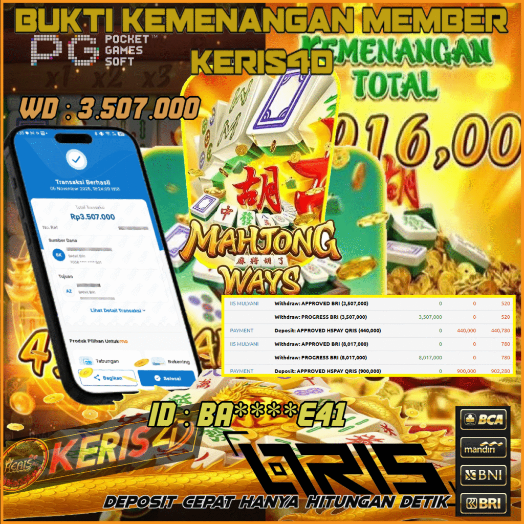 KERIS4D dikenal sebagai situs terpercaya yang selalu menghadirkan pengalaman bermain slot online yang aman, fair, dan berlisensi resmi. Di sini, kami tidak hanya sekadar memberikan janji, tapi bukti nyata berupa slip kemenangan yang dapat Anda lihat secara langsung.