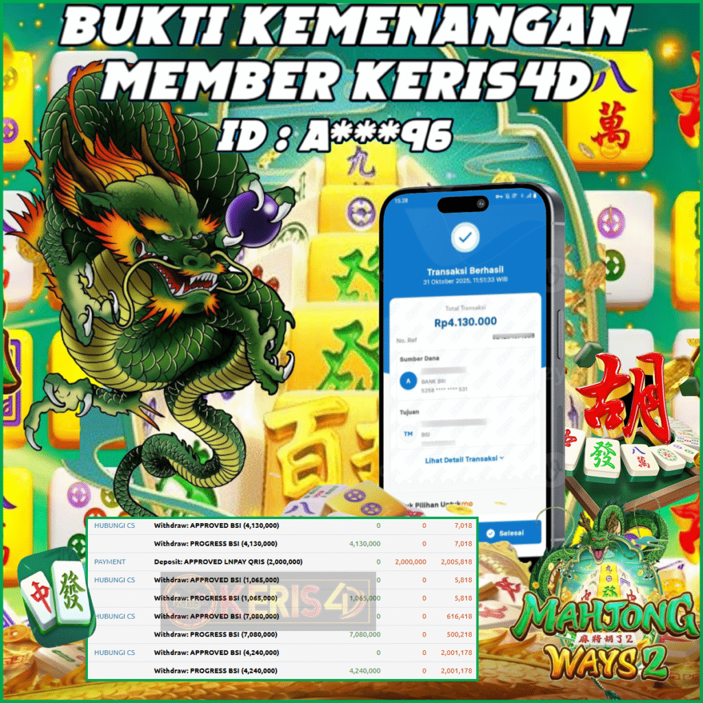 KERIS4D dikenal sebagai situs terpercaya yang selalu menghadirkan pengalaman bermain slot online yang aman, fair, dan berlisensi resmi. Di sini, kami tidak hanya sekadar memberikan janji, tapi bukti nyata berupa slip kemenangan yang dapat Anda lihat secara langsung.